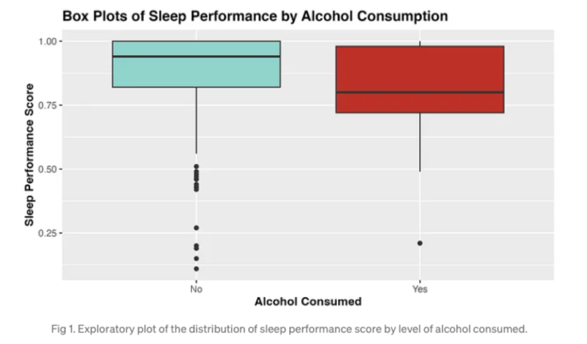 - Individuals who did not consume alcohol (labeled "No") generally have a higher sleep performance score. The median sleep performance score for the "No" group is near 1.0, while for the "Yes" group (alcohol consumed), the median score appears closer to 0.75.